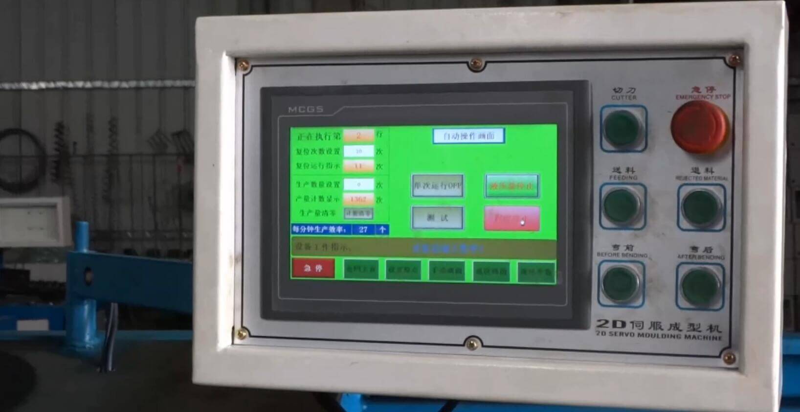 3、可調(diào)液壓油缸剪切,可以保證圓圈切口的整齊性,剪切時(shí)間和退刀時(shí)間均可以在文本顯示器上直接修改;